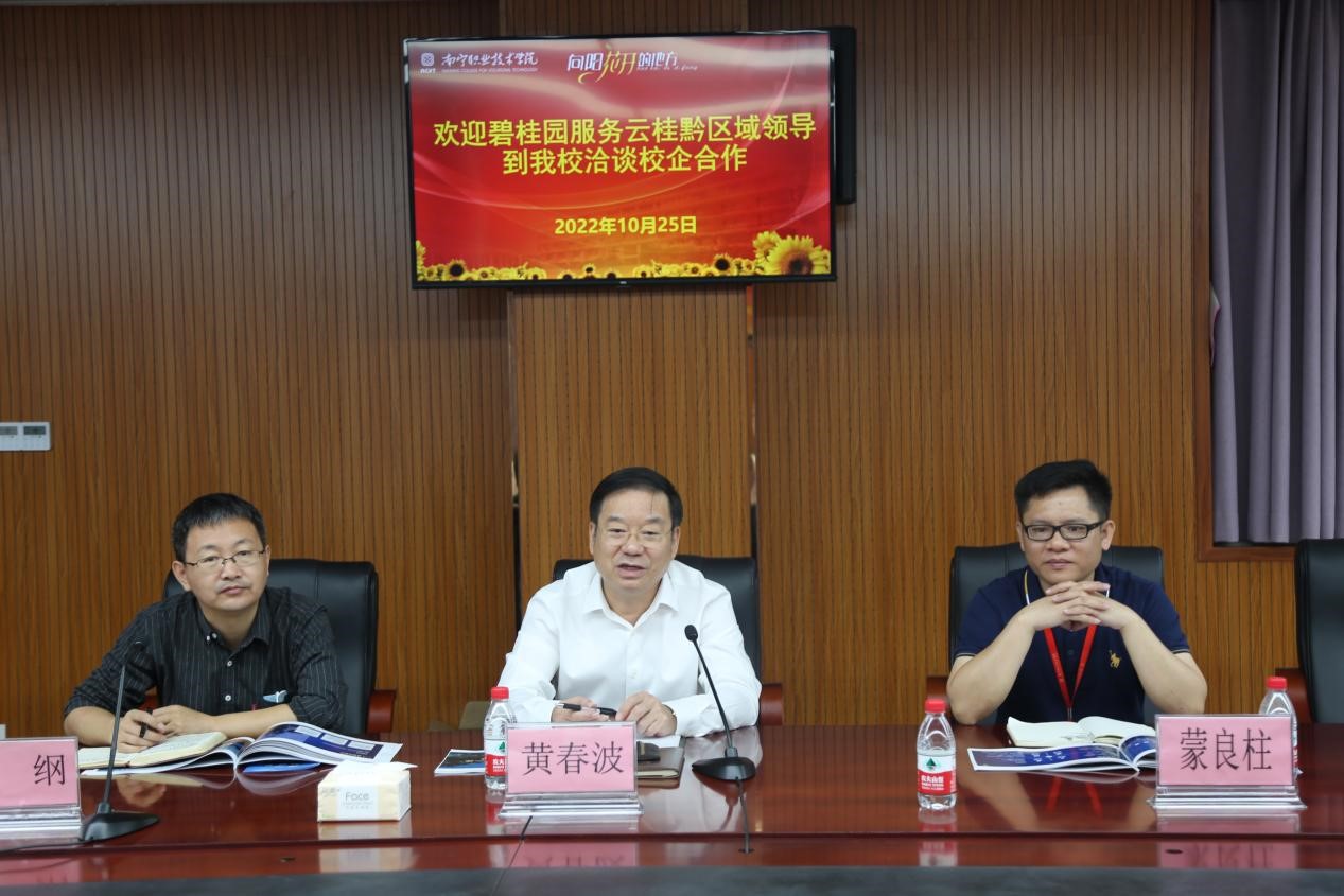 黄春波介绍了南宁职业技术学院的发展历程,并表示南宁职业技术学院能与这样优秀的企业进行深度合作,是对公司以往办学成绩、办学实力的充分肯定,也是对我们以往友好合作的充分肯定。学校今后会以社会发展的需求为方向,采取开放办学的模式,坚定不移地走产、学、研一体化的道路,在与企业的合作中实现优势互补、利益共享,从而进一步增强学校发展的后劲和活力。