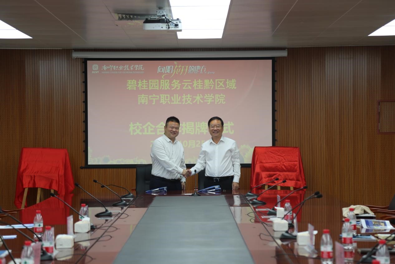 会议最后,校企双方领导共同签订校企合作协议,并揭牌合影留念。本次校企合作签约暨授牌仪式的成功举行,为校企双方进一步开展多层次、多形式、多领域的合作,实现校企资源的有机结合和优化配置,共同培养区域经济社会发展需要的人才提供了契机。相信在“优势互补、共同发展”的合作理念下,公司与碧桂园服务云桂黔区域未来的发展定会再上新的台阶。