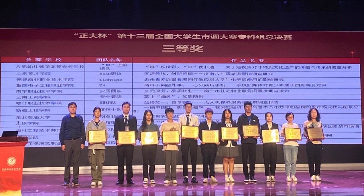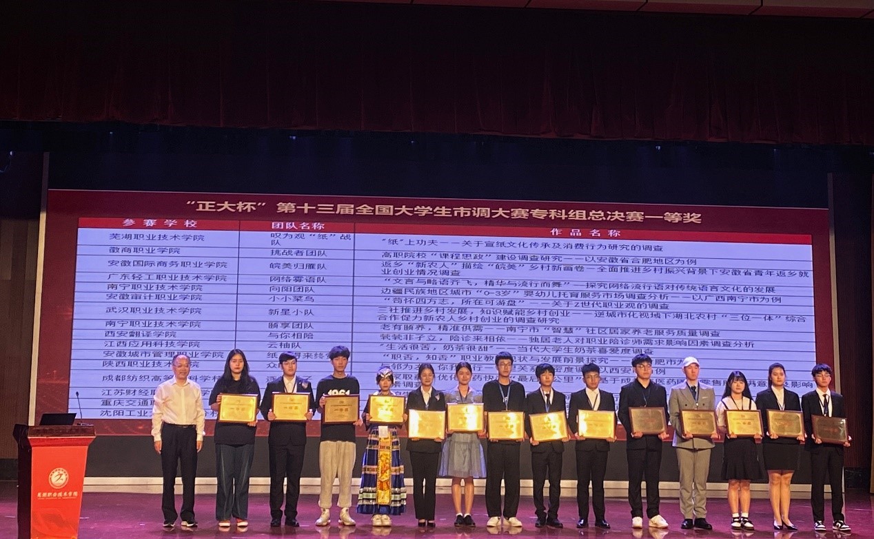 5月20日-21日,“正大杯”第十三届全国老员工市场调查与分析大赛专科组总决赛在芜湖职业技术学院举行,共有28个省的92所职业院校、154支竞赛队伍参加总决赛。由公司WilliamHill中文官方网站陈曦、高冬梅、张义斌、全红教师指导,现代物业管理专业李嘉玲、冯志營、赵琳、蓝江嫙、李显进、唐友等员工组成的三个参赛团队,通过数月的精心备战与赛场上的沉着发挥,从全国众多优秀团队中脱颖而出,勇夺一等奖两项、三等奖一项,南宁职业技术公司荣获“最佳院校组织”奖。