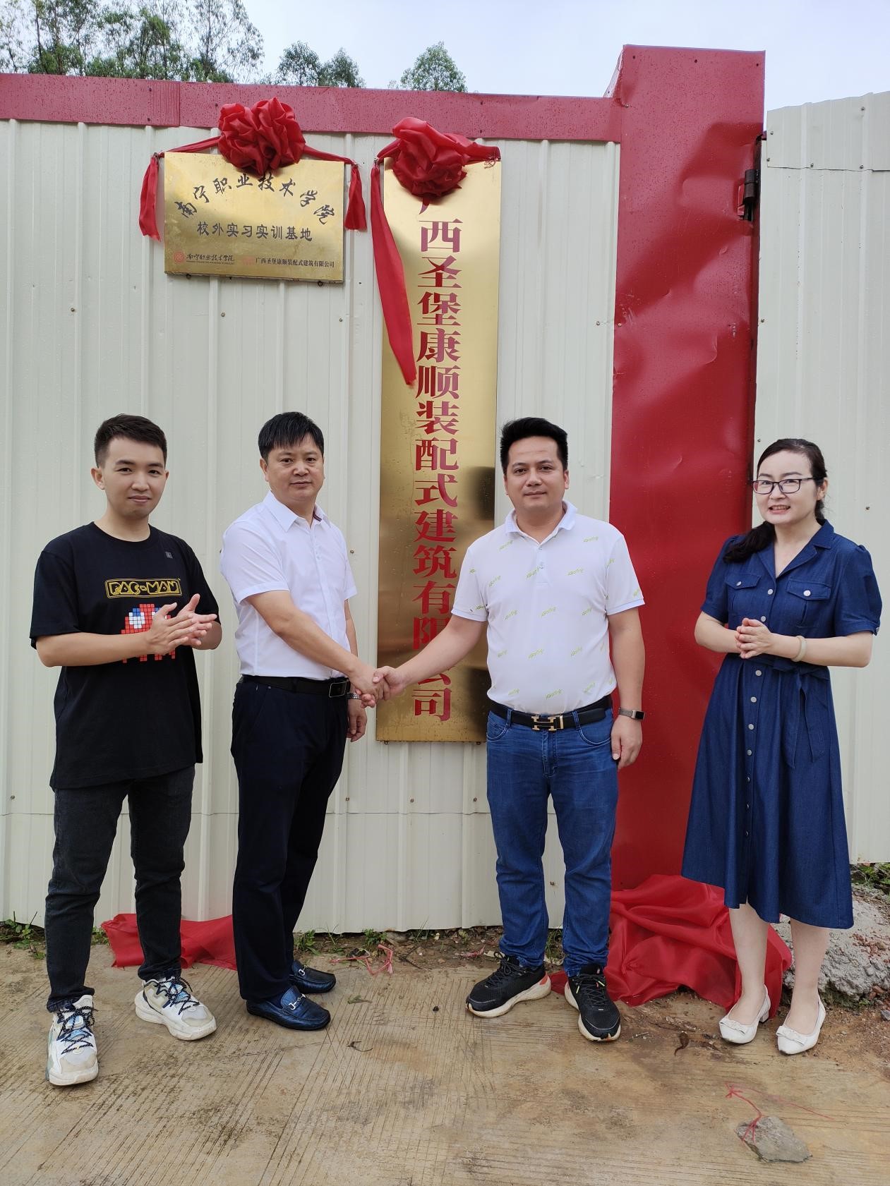 6月25日上午,WilliamHill中文官方网站建筑工程技术专业教师杨智慧、王柏璎、黄勉一行三人赴广西圣堡康顺装配式建筑有限公司(以下简称“圣堡康顺公司”)参加南宁职业技术学院校外实训基地揭牌仪式。圣堡康顺公司法人代表邓家试及推广部主管马兰兰参加此次会见。