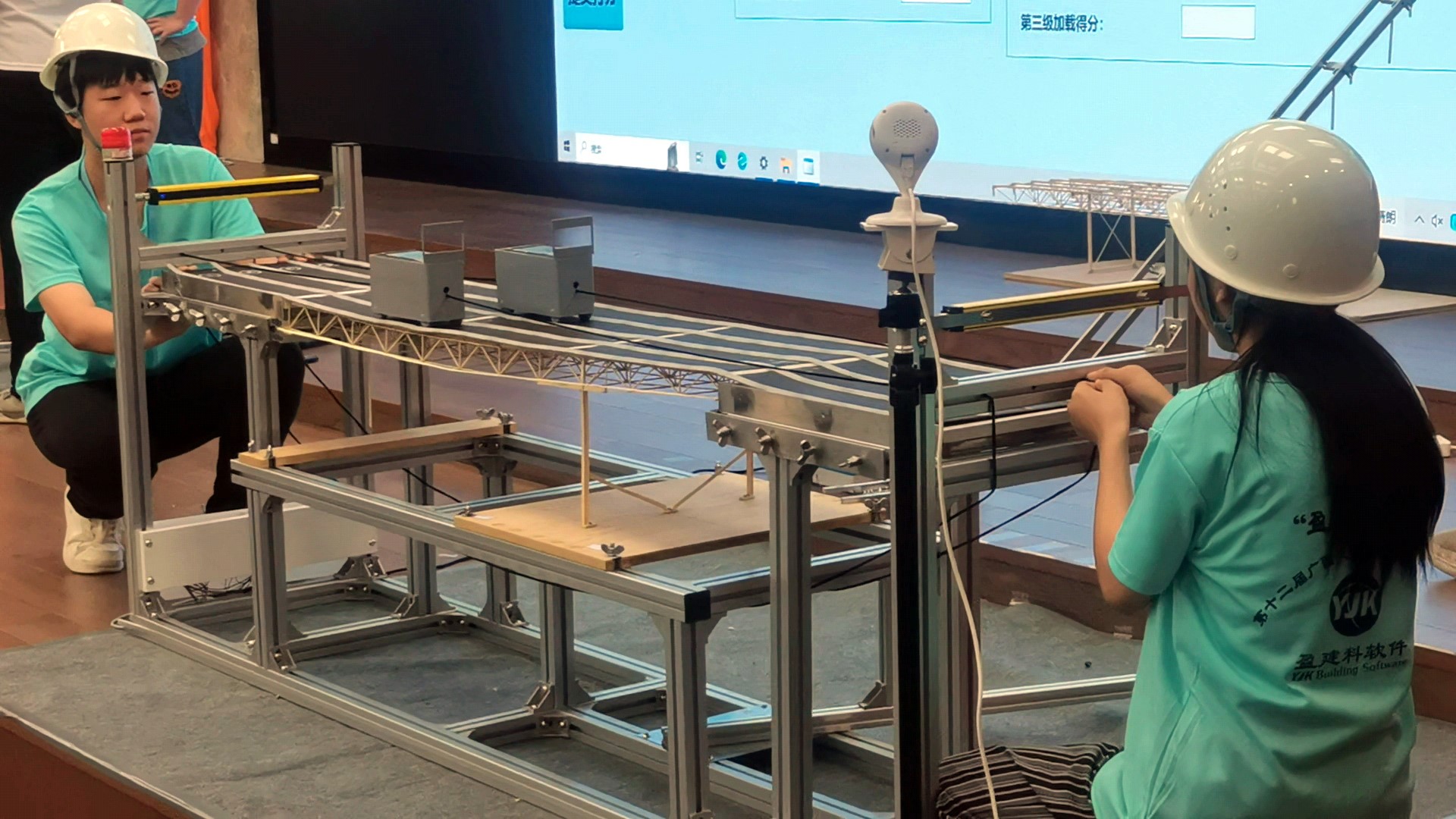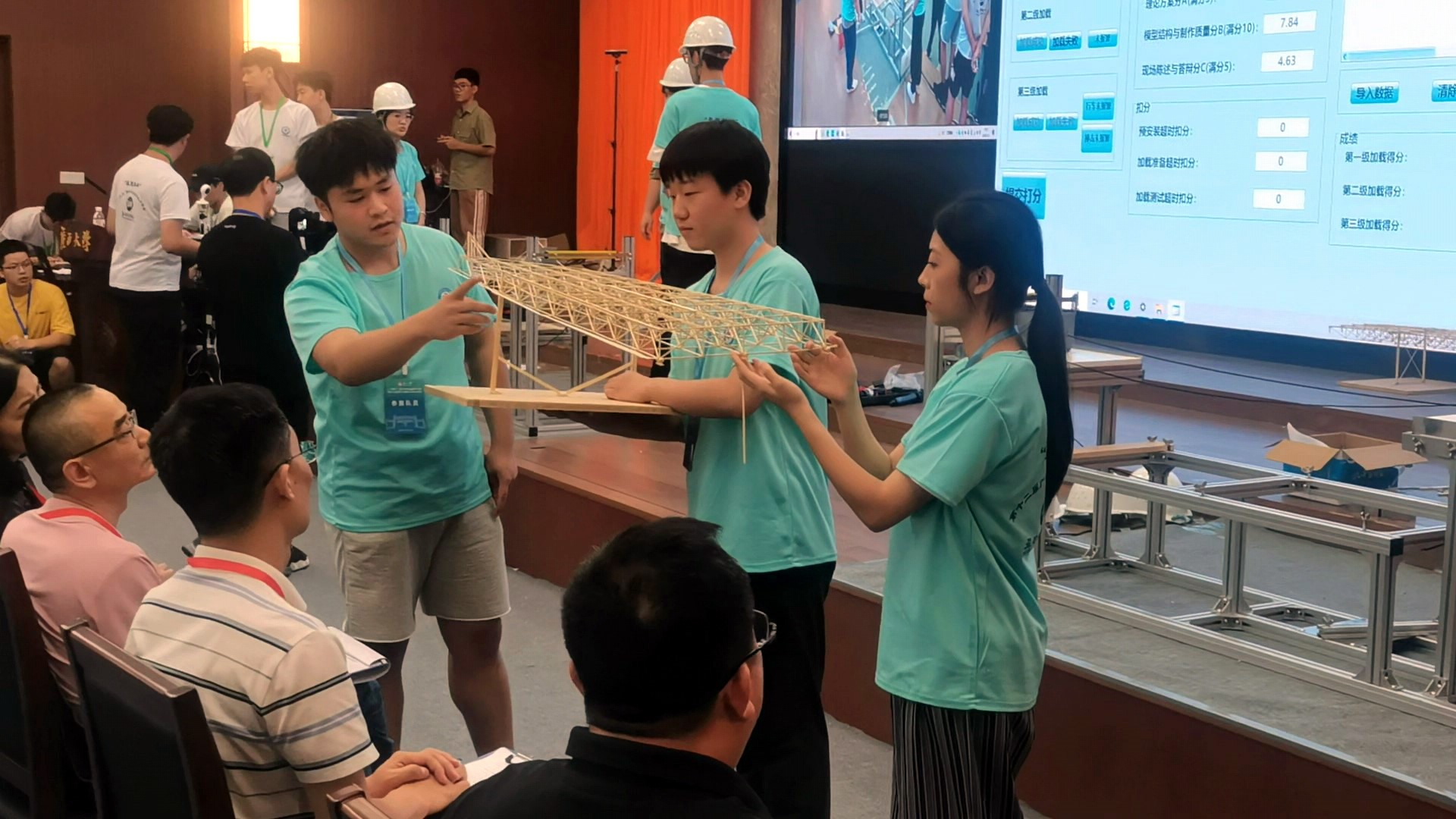 此次大赛以“撞击荷载下变参数两跨四车道桥梁结构设计与制作”为题,竞赛包括现场理论方案设计与物理模型制作两个阶段,在比赛规定16.5小时内,参赛选手利用给定的竹皮、竹杆、工具完成模型制作且须满足尺寸要求,考验了组员的相互沟通配合、动手动脑及专业知识的综合运用能力。模型制作完成后,由参赛组员进行1分钟陈述,评委2分钟提问答辩,再进行现场模型加载。