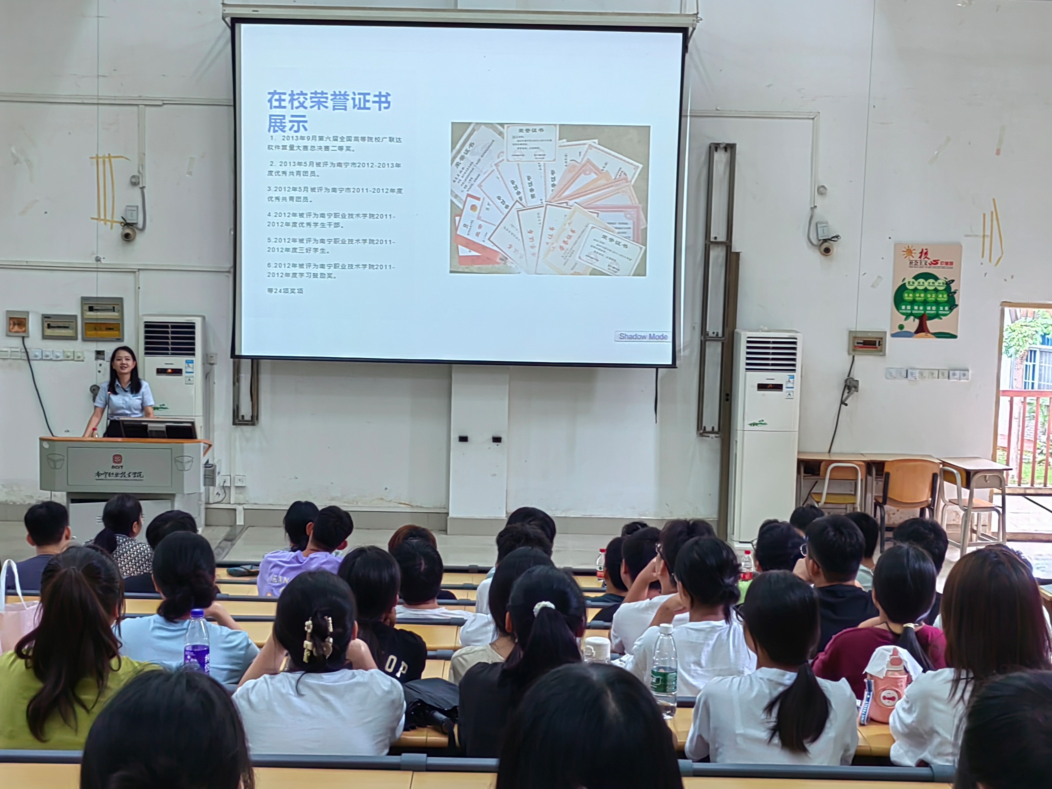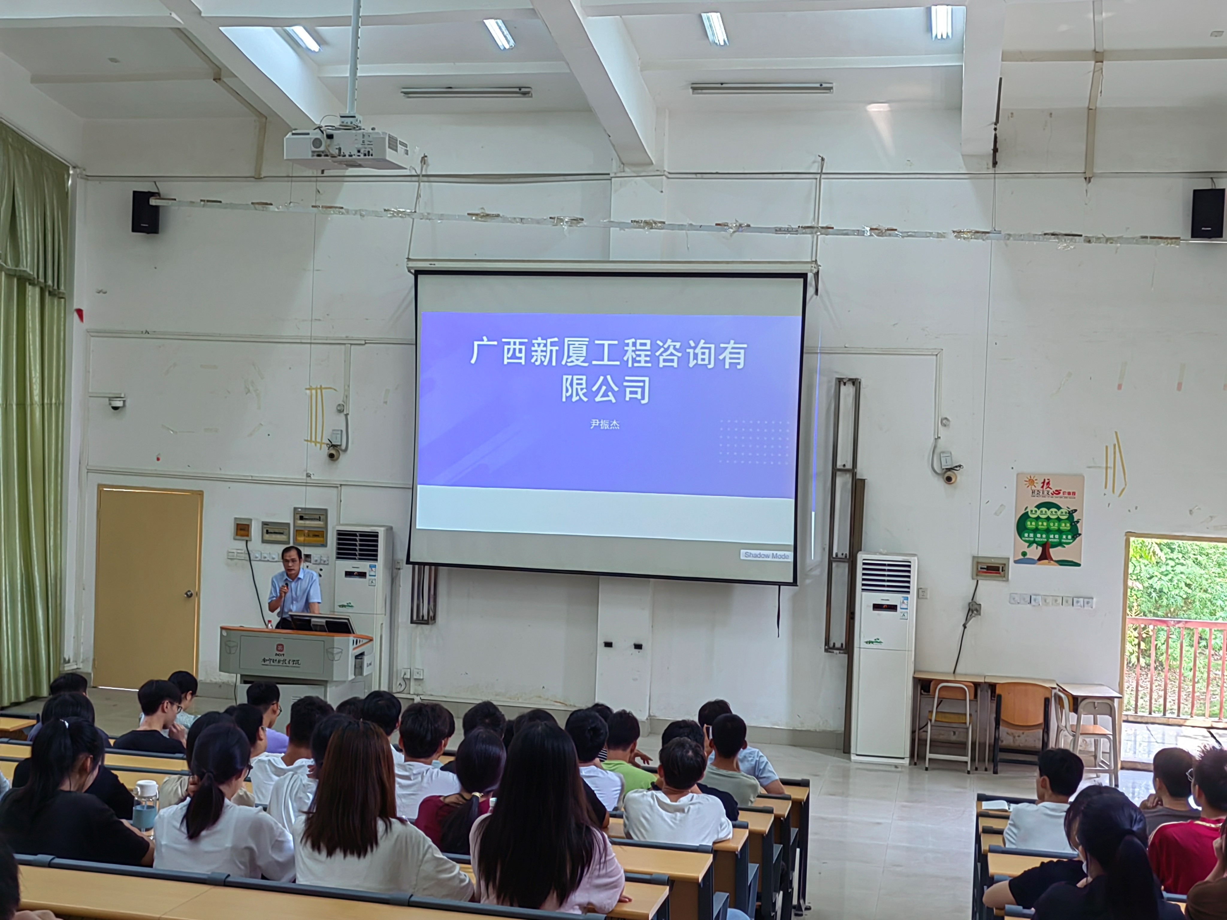 其次,企业专家广西新厦工程咨询有限公司董事长尹振杰从工程造价行业发展前景、工程造价专业就业方向、就业前景、企业需要什么样的人才、在校员工应如何准备等几方面的内容做了详细的介绍,指导了新生做好职业规划,有效提升了新生对专业的认可度,增强了专业学习信心。工程造价专业优秀毕业生代表麻志京发言,她分享了自己在校的学习经历以及就业的成功经验和心路历程,并给出在校三年学习生活的建议。