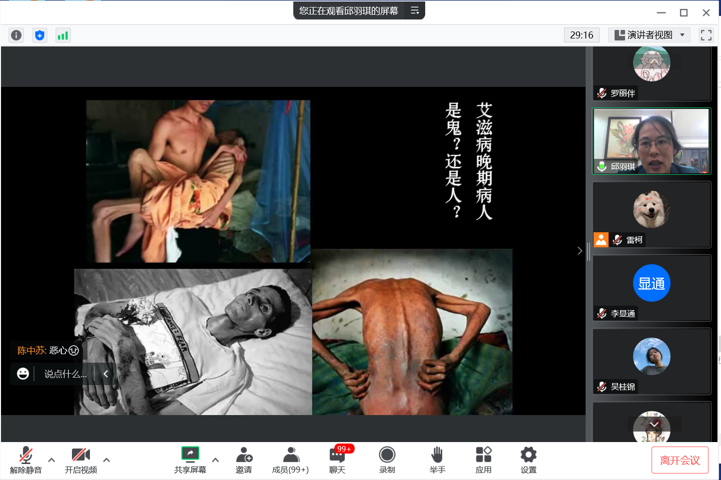 (图为:邱羽琪医生向同学们展示艾滋病临床症状的图片)
