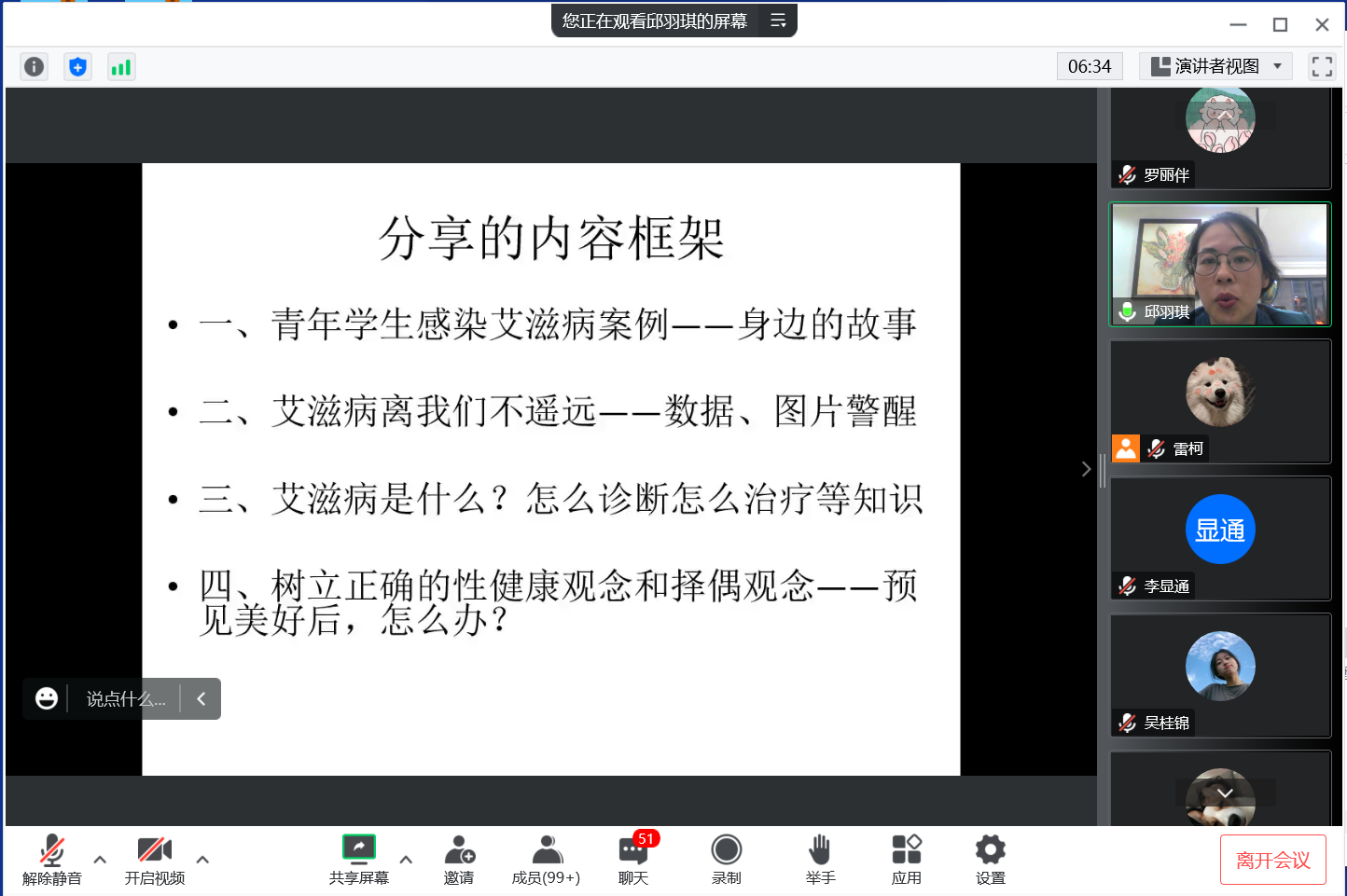 为了进一步宣传和普及预防艾滋病的知识,让员工进一步了解艾滋病,切实提高员工预防艾滋病的知识、能力以及提高健康防范意识。2022年10月30日晚上六点半,WilliamHill中文官方网站邀请南宁市卫生健康委员会艾滋病防治科三级主任科员邱羽琪为2022级全体新生开展了线上防艾宣传讲座活动。公司全体2022级新生参与了此次宣传讲座。
