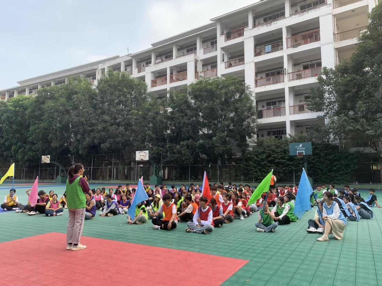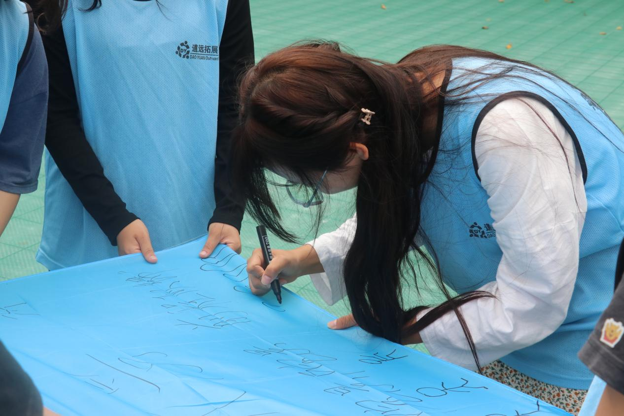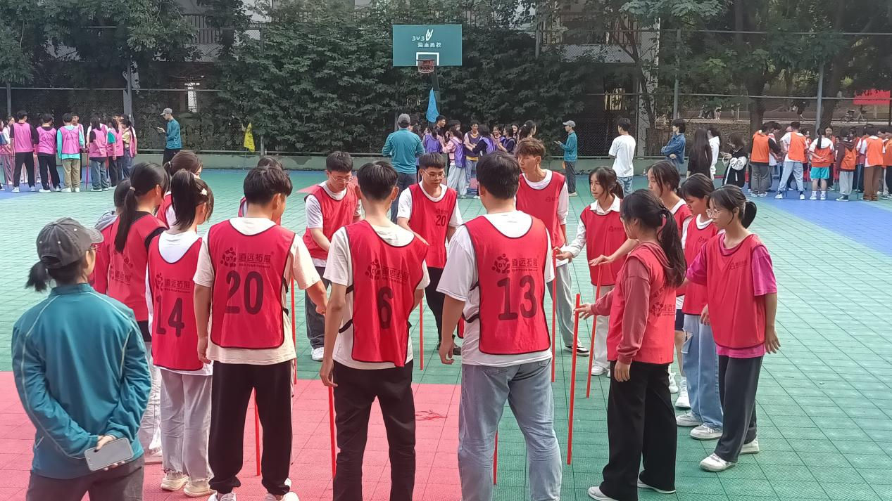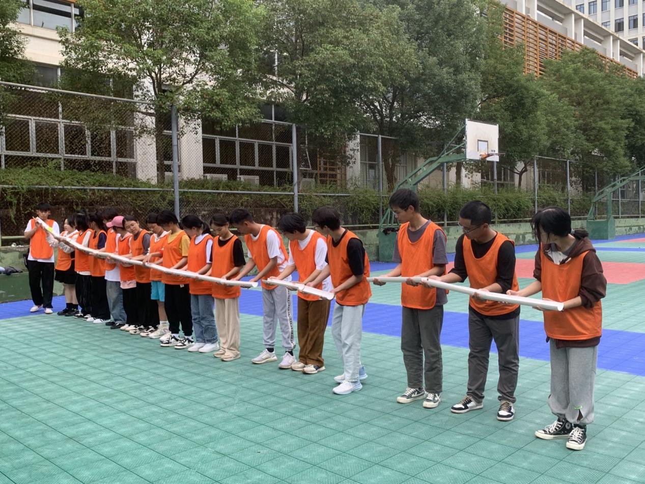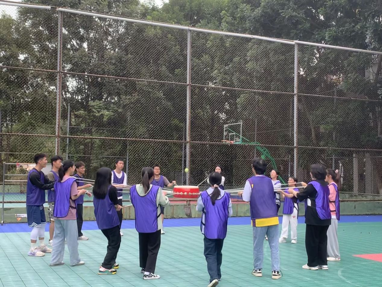 活动开始,训练教官为了快速拉近各位学员的距离,组织了破冰游戏,通过前后同学互相帮忙拍拍肩捶捶背,大家从沉默不语变成了欢声笑语。让大家处于一个放松的状态后便进入本次训练活动的核心环节——组建团队合作活动。教官指导同学们用“南宁职业技术学院”学校名字依次报数,报到相同文字的同学则为一组,共分为八组,组建好团队,选出队长、讨论口号、制作队旗,把原本陌生的学员打造成八个团队。八组同学一分为二,四组体验“珠行千里”,另外四组体验“鼓动人心”,相互之间进行竞赛,竞赛结束后交换游戏项目继续开展。最后一项集体活动“绕杆接力”,通过互相传递一根直立的杆子,在规定的时间完成并且保证不倒,考验小组成员高度的配合。