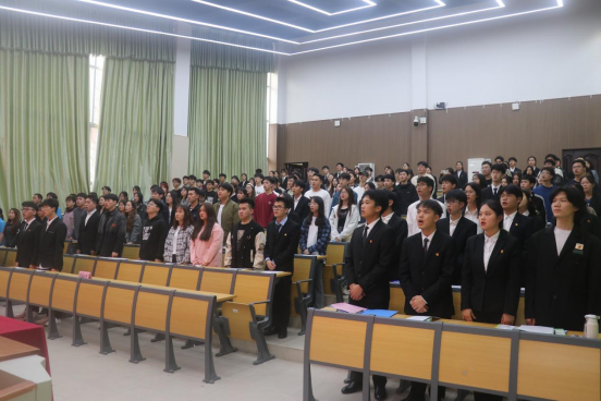 伴随着庄严的国歌,大会拉开序幕。全体师生肃立,奏唱国歌。