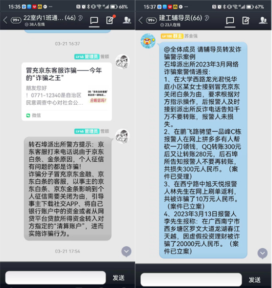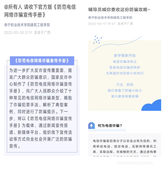 公司员工管理中心主任苏金强在辅导员工作群进行常态化防范电信网络诈骗相关案例分享,专职辅导员在所带班级召开3月份防范电信网络诈骗专题班会,“南宁职业技术学院WilliamHill中文官方网站”官方公众号转载多条防电信诈骗相关文章,及时向员工传达最新防诈反诈知识,加强案例警示教育,引起同学们对电信诈骗问题的重视,提醒员工保护好人身财产安全,防患于未然。