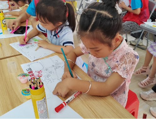 图为:小朋友认真绘制禁毒手抄报(杨欣怡/摄)