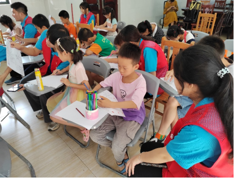 图为:志愿者辅导小朋友绘画禁毒手抄报(杨欣怡/摄)