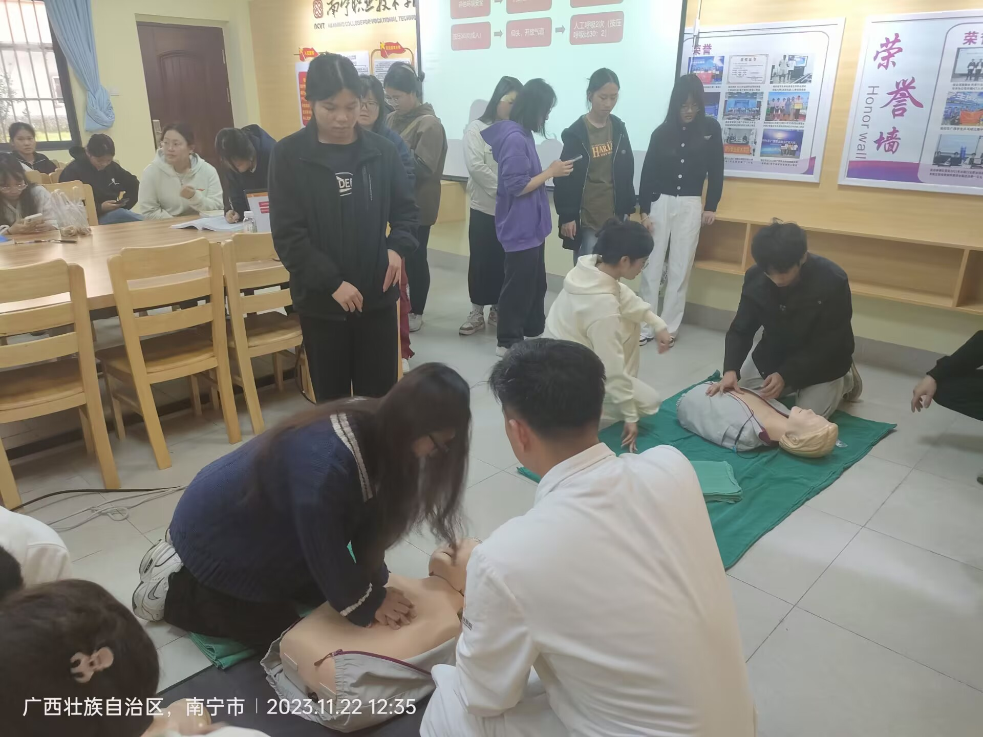 本次宣讲活动共分两个部分。第一部分,广西国际壮医医院重症医学科医生给现场同学们讲解如何给突发危险的伤病患者进行心肺复苏急救知识。讲解的农安医生通过引入案例开展宣讲,让同学们充分了解心肺复苏急救知识。第二部分,开展心肺复苏现场演示和实操练习。广西国际壮医医院医生先进行演示一遍,随后分为四组,对同学们进行一对一指导同学们操练。