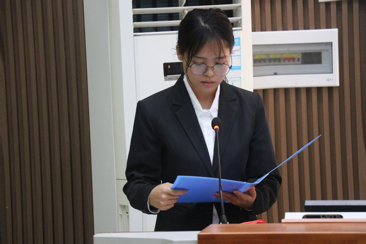 员工会办公室主任区欣雨述职 (陆缘/摄)