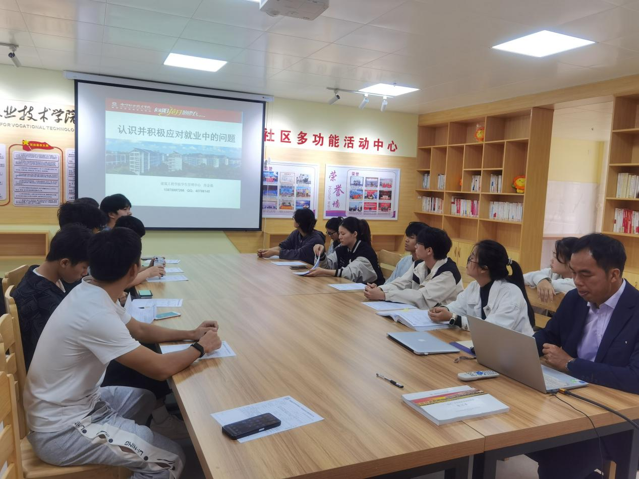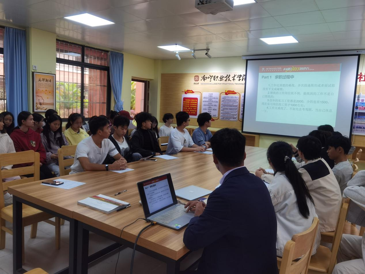 苏金强主任首先对广西青年留桂就业政策和我区支持青年人才创新创业的优惠政策进行宣传,让同学们全面了解就业创业政策,拓宽就业方向。接着根据2021级同学即将要走上实习岗位这一实际,围绕“认识并积极应对就业中的问题”的中心主题,通过案例告诉同学们在求职过程中、实习或就业过程中等方面会遇到的人际关系、能力提升等问题,对同学们提出建议。