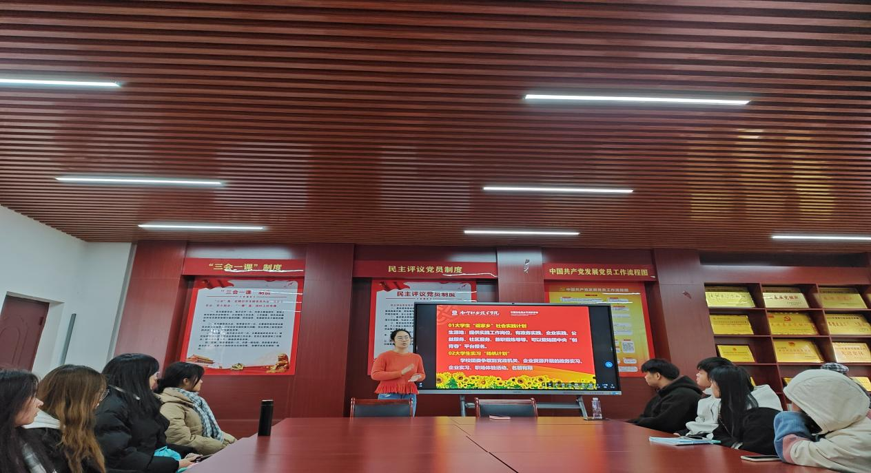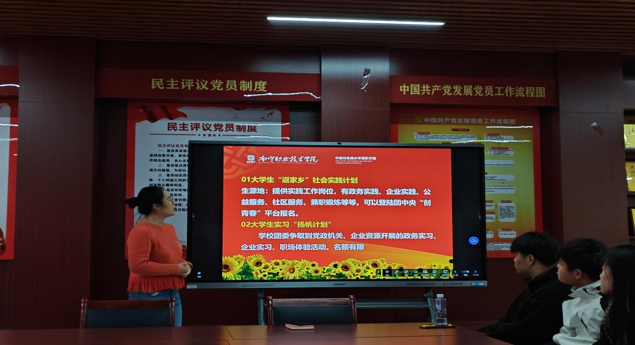 会议上,任静老师向同学们介绍了“广西青年爱广西”就业促进“1+10”帮扶计划,重点介绍了和在校同学密切相关的老员工“返家乡”社会实践计划,她鼓励同学们要好好把握好这个寒假,积极报名实践工作,多参与政务实践、企业实践、公益服务、社区服务、兼职锻炼等等。任静老师还结合公司团支部进社区活动具体开展情况,向同学们介绍了老员工社区实践计划,要求每个支部每学期必须进一次社区开展实践,可以参与社区治理、课后服务、开展专业相关的社会调查、文体活动等等,希望同学们能够精心策划,认真筹备,形成“一支部一特色”的社区实践品牌。任静老师还介绍了“老员工实习扬帆计划”、“老员工精准留桂就业计划”、“老员工乡村创业帮扶计划”等就业促进政策,让同学们进行了全面了解。