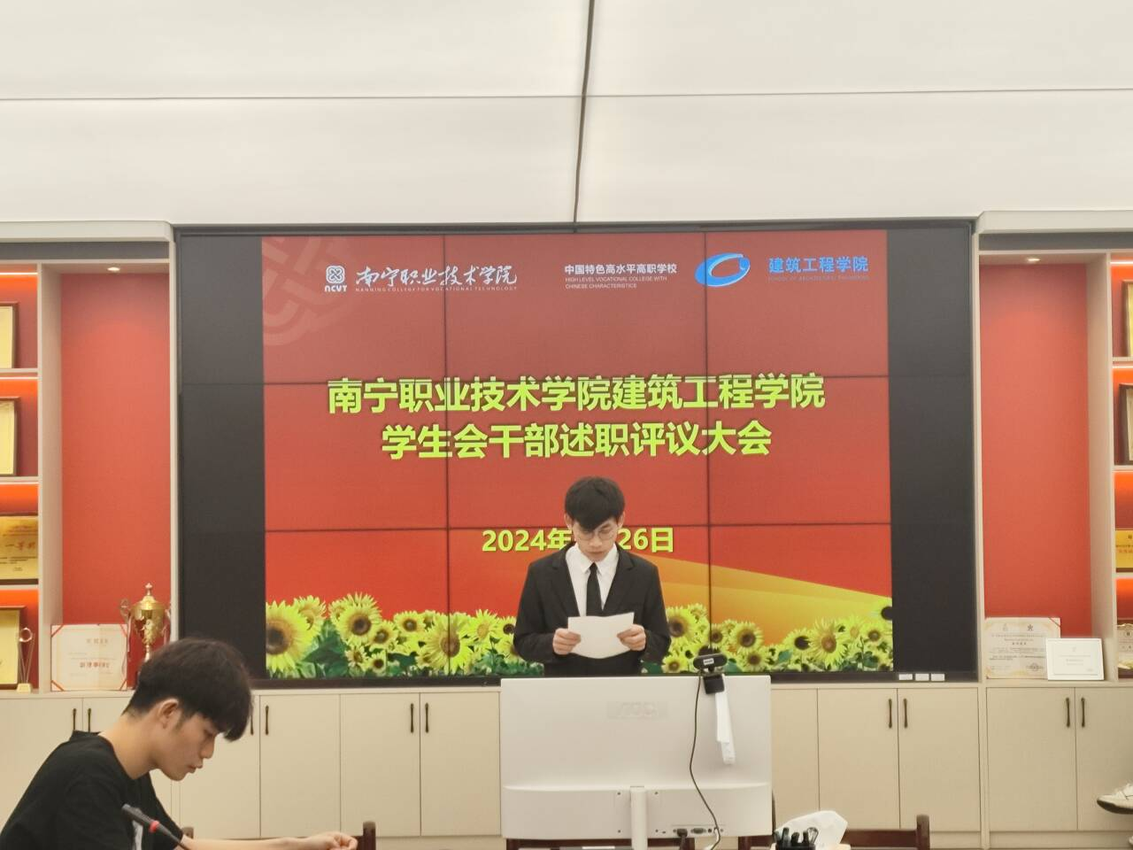 评议大会开始,毛月算、黄菊香、陈淇等9名员工会干部依次进行述职,他们按照要求开展春季学期工作述职,任静老师在述职结束后针对9名同学分别进行了点评,班级代表也认真参与评分提出建议。