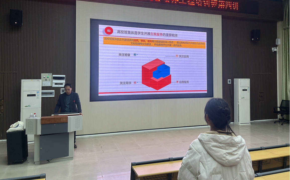 讲座伊始,苏金强结合当代青年特点,强调了优良班级建设的重要性,并就什么是优良班级,以及如何推进优良班集体建设进行了详细阐述。他提出:一是要以目标驱动班集体建设,用班级建设目标牵引个体发展目标,凝聚力量,推动班集体良好健康发展;二是以员工骨干引领班集体建设,注重挖掘班级各类同学骨干,使其自觉树立带头意识、责任意识、奉献意识,发挥引领作用;三是充分联系辅导员、班主任、任课教师,加强指导,推进班级建设;四是从宿舍建设、对各类困难员工开展帮扶等方面做好班级建设。他要求,员工干部要在学业学习、文体活动、宿舍管理、个人发展等方面做好自己,将个人力量转化为集体力量,成为优良班级建设的推动者。