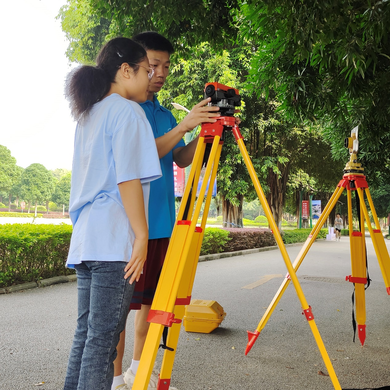 建筑测量协会10月19日上午9:00,建筑测量协会在金葵广场举行 “我为同学办件事——水准测量培训活动”。会长郭华康组织活动,对不同专业的参与同学分组后,由曾获奖的翟辉和陈业烨进行水准测量理论讲解与示范,并带领实操教学训练。各小组在核心骨干一对一指导下实践操作调平仪器,活动圆满结束,同学们更好地理解和运用了测量专业知识,为学院选拔技能大赛选手奠定基础。