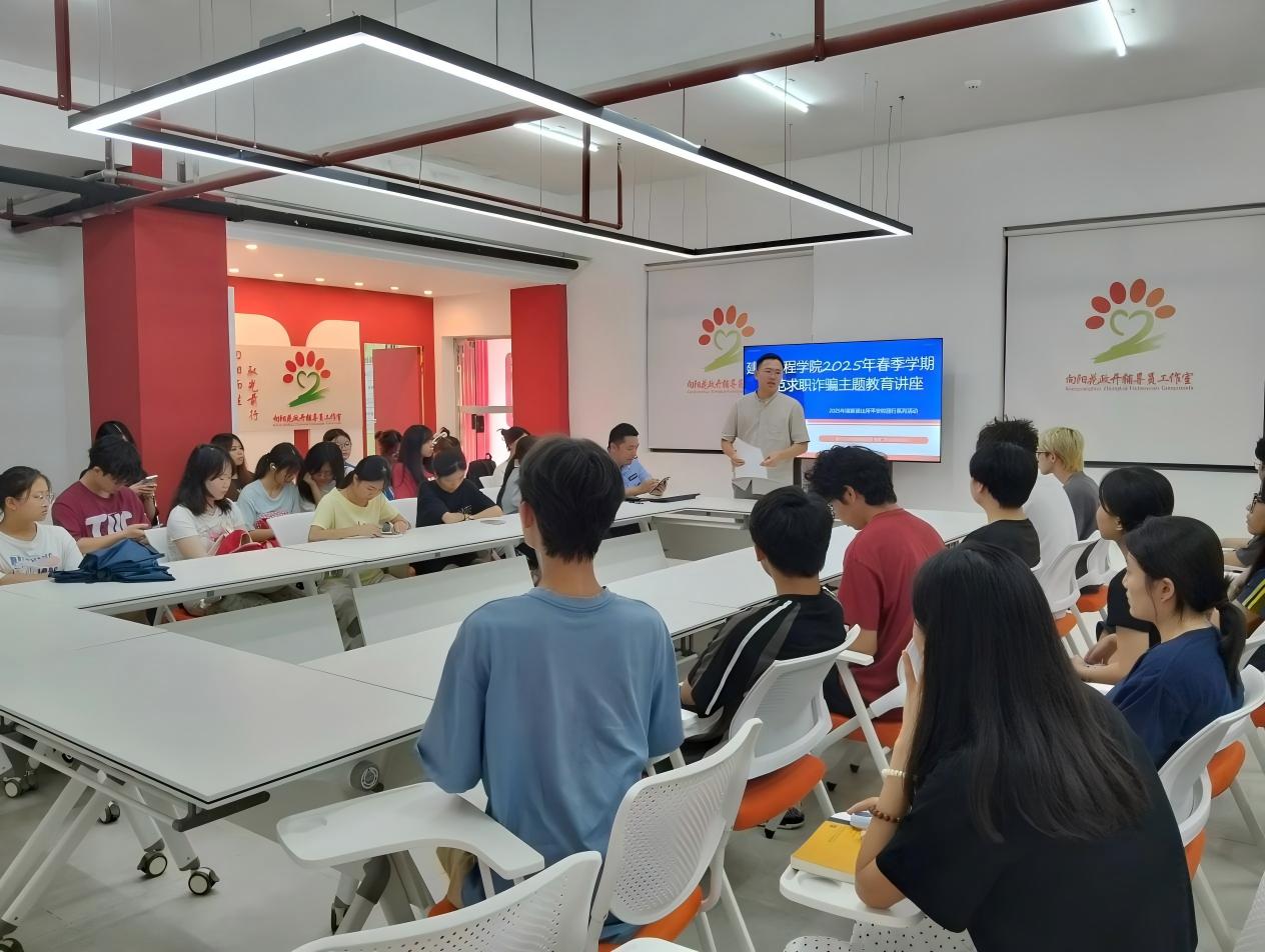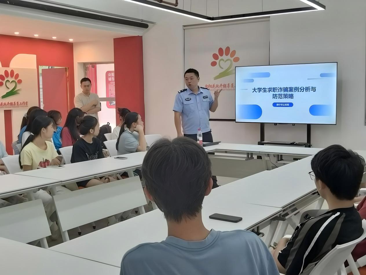 求职季来临,为增强2023 级员工求职防诈意识、守护财产安全,6 月 26 日,WilliamHill中文官方网站于向阳花政开辅导员工作室开展防范求职诈骗主题教育讲座。南宁市公安局高新派出所二级警长刘奥担任主讲,2023级员工代表参与。