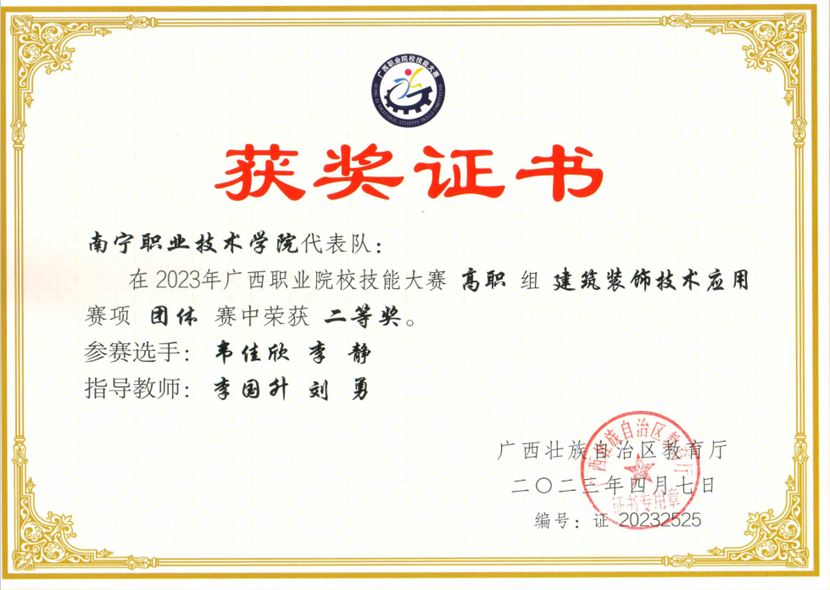 1、2023年广西职业院校技能大赛建筑装饰技术应用赛项二等奖